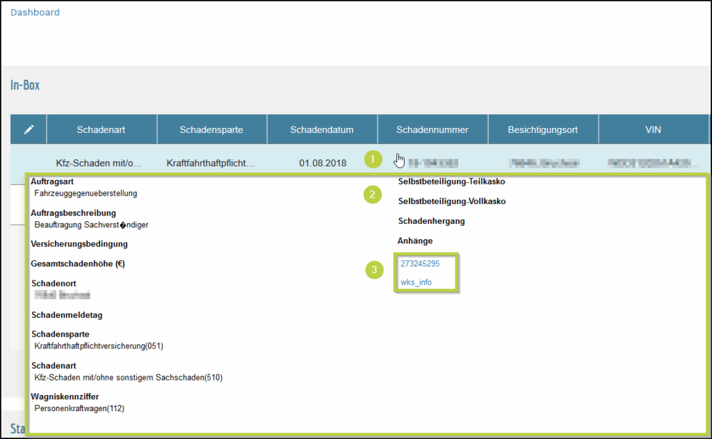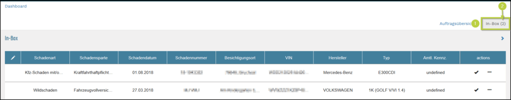 Wechseln Sie im Dashboard in den Tab In-Box (1). Die Ziffer in Klammern (2) gibt Ihnen bereits die Information über die Anzahl der Beauftragungen Ihrer Partnerversicherung(en), welche noch nicht importiert wurden: