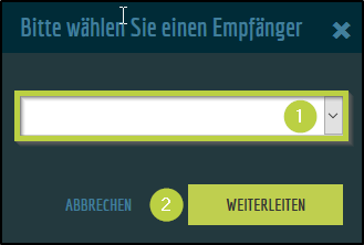 In dem Dialog Bitte wählen Sie einen Empfänger können Sie in dem Listenfeld einen anderen Sachverständigen auswählen, welcher den Auftrag bearbeiten soll. Bestätigen Sie den Dialog mit WEITERLEITEN: