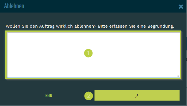Erfassen Sie in dem Dialog Ablehnen einen entsprechenden Grund (1) und bestätigen mit JA (2):