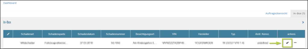 Klicken Sie bei dem gewünschten Auftrag in der Spalte actions auf das Häkchen, damit importieren Sie den Auftrag in DYNAREX: