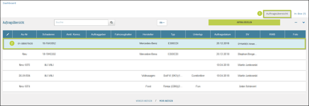 Um Informationen (2) und dazugehörige Dokumente eines Auftrages einsehen zu können, klicken Sie den Datensatz einfach mit der linken Maustaste an (1).