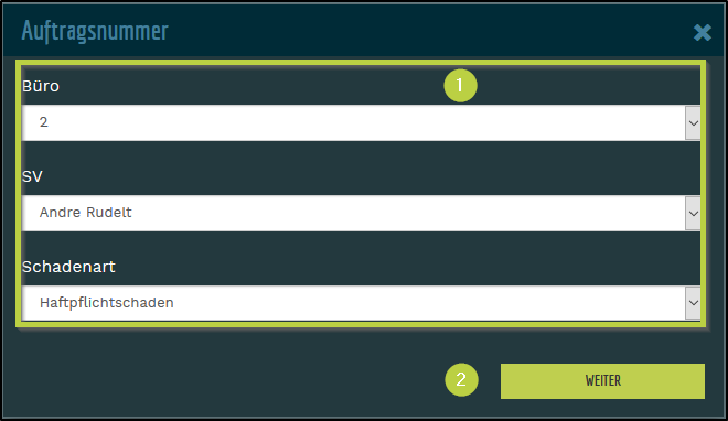 Klicken Sie auf den importierten Auftrag, um diesen zu öffnen. Füllen Sie den Dialog Auftragsnummer entsprechend mit Daten und bestätigen mit WEITER: