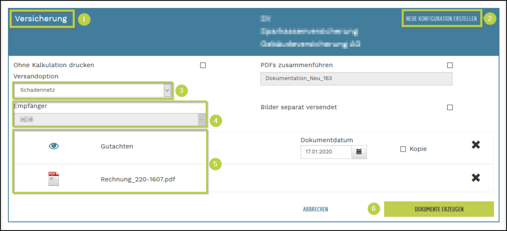 Wechsel Sie dazu in die Auftragsmaske Dokumente und klicken bei der Adresse Versicherung (1) auf NEUE KONFIGURATION ERSTELLEN (2).