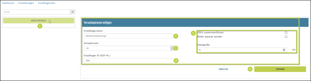 Navigieren Sie zu Dashboard\Systemeinstellungen\Auftrag\Empfängerliste konfigurieren und Speichern Sie die Einstellungen Ihrer Partnerversicherung(en):