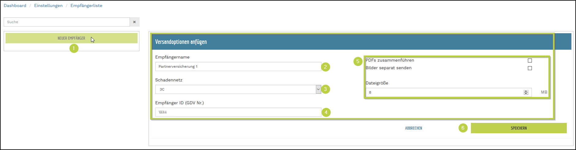Navigieren Sie zu Dashboard\Systemeinstellungen\Auftrag\Empfängerliste konfigurieren und Speichern Sie die Einstellungen Ihrer Partnerversicherung(en):