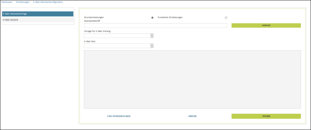 Dazu wechseln Sie unter Dashboard -> 3-Punket-Menü -> Einstellungen -> Auftrag -> Versand -> E-Mail Restwertanfrage