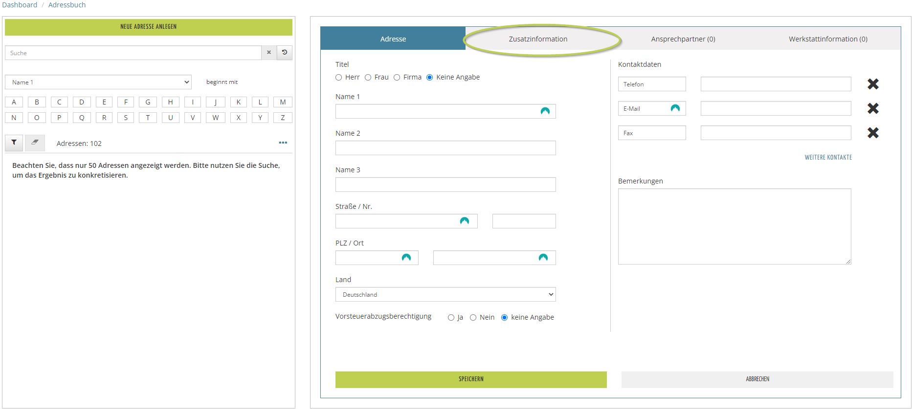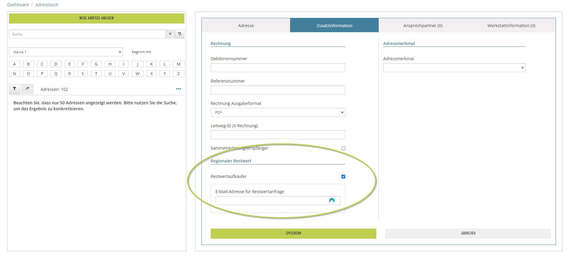 Sie können beliebig viele Adressen für als Restwertaufkäufer definieren.