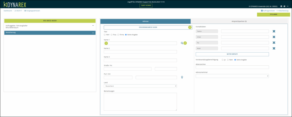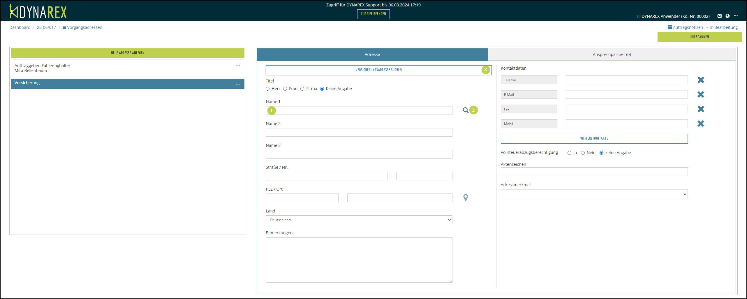 Neben den bekannten Varianten der Suche durch Erfassen des Namens (1) oder Klick auf die Lupe (2), gibt es den neuen Button VERSICHERUNGSADRESSE SUCHEN (3).