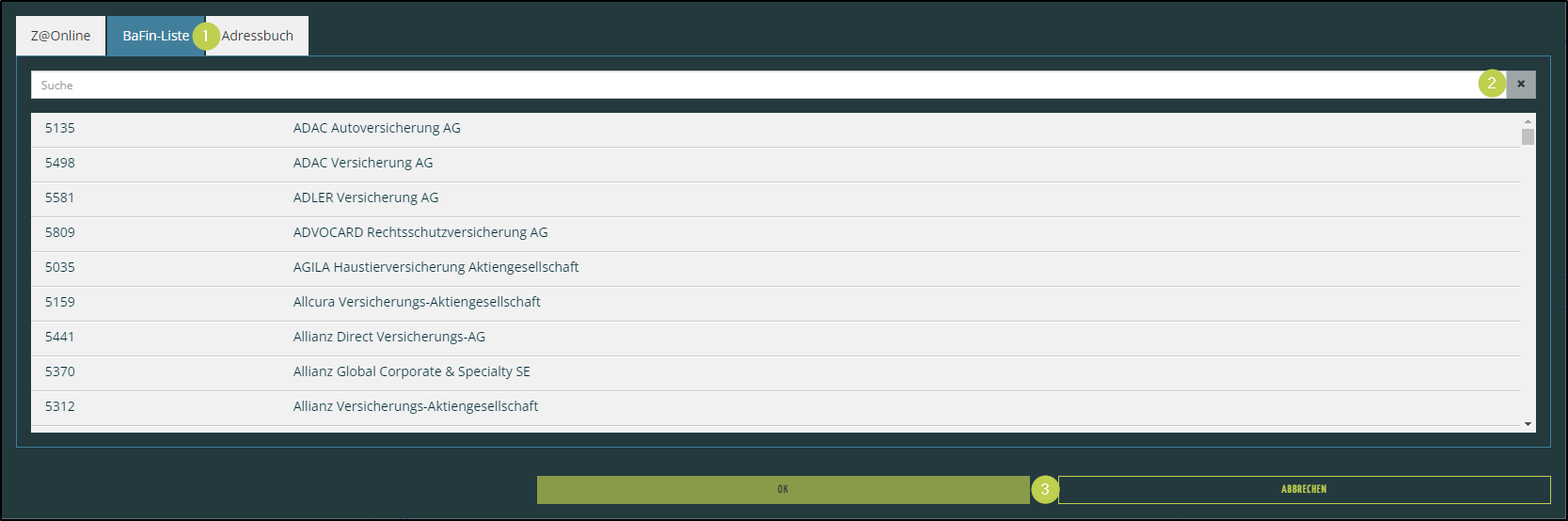 In der BaFin-Liste(1) finden Sie alle bei der BaFin gelisteten Versicherungen. Sie können dabei zum schnellen Finden die Volltextsuche benutzen (2) und die Versicherung anschließend in den Auftrag übernehmen (3).