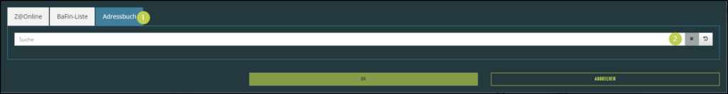Der 3. Tab ist der Zugriff auf Ihr eigenes Adressbuch(1). Auch hier können Sie die Suchfunktion (2) nutzen.