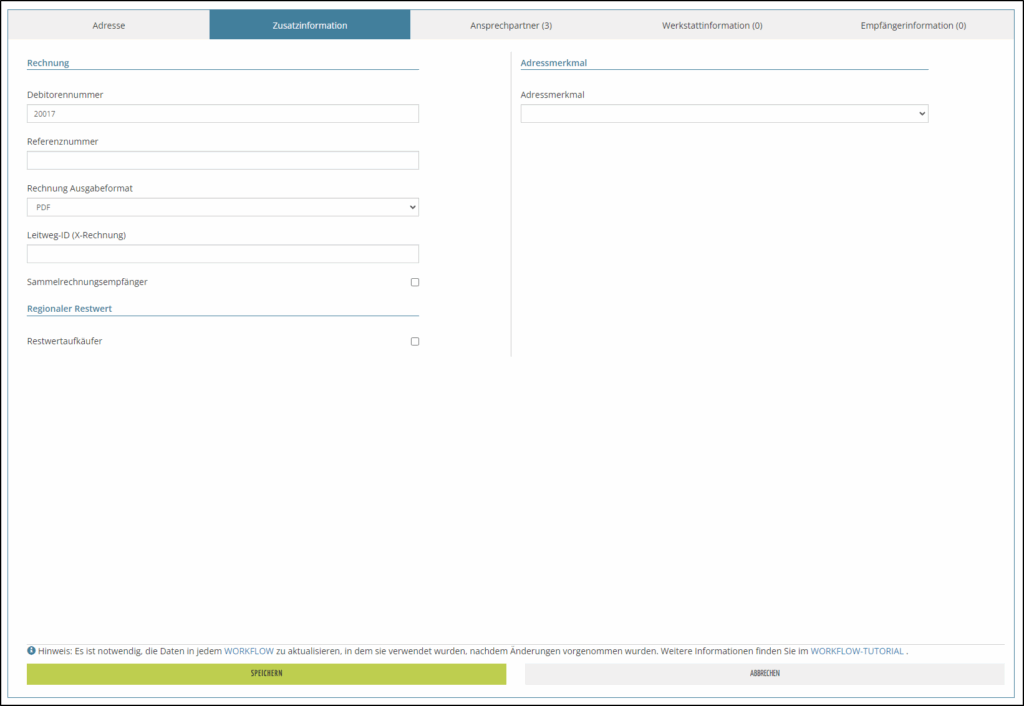Nach dem Speichern der Adresse haben Sie die Möglichkeit „Ansprechpartner“, „Zusatzinformationen“ und die Verrechnungssätze in den „Werkstattinformationen“ einzutragen und abzuspeichern.