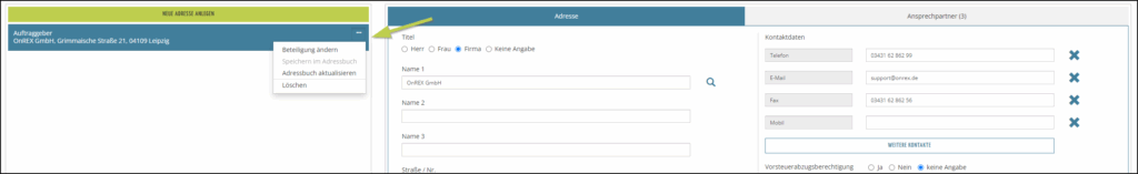 Auch das abspeichern und aktualisieren einer Adresse im Adressbuch ist aus dem Auftrag direkt möglich.