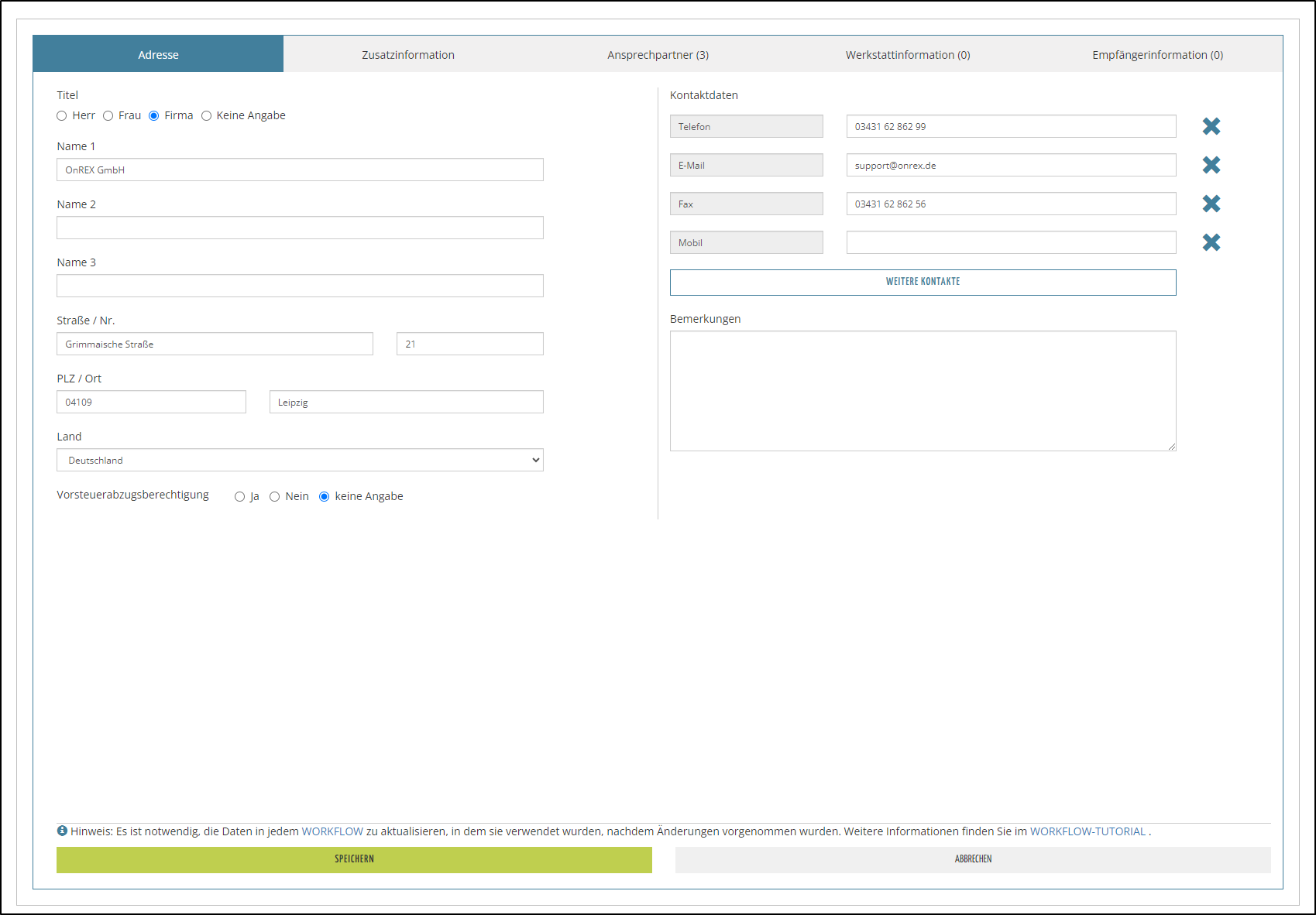Nach dem Speichern der Adresse haben Sie die Möglichkeit „Ansprechpartner“, „Zusatzinformationen“ und die Verrechnungssätze in den „Werkstattinformationen“ einzutragen und abzuspeichern.