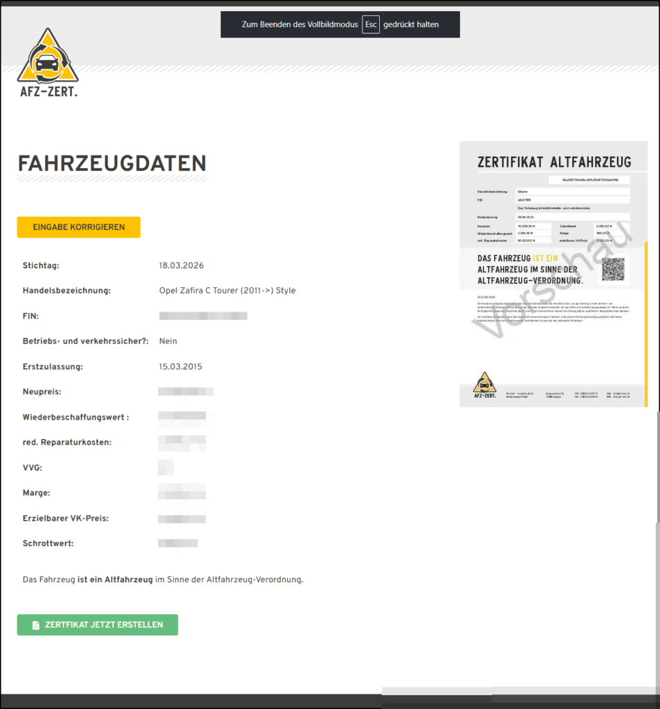 Nach der Vorschauen stehen Ihnen Funktionen wie EINGABE KORRIGIEREN oder ZERTIFIKAT JETZT ERSTELLEN zur Verfügung.