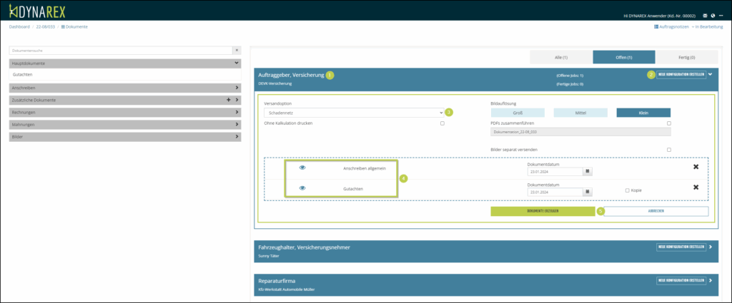 Zur Fertigstellung des Auftrages im DYNAREX, senden Sie Ihre Dokumente an das Modul zurück.