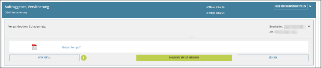Erstellen Sie das gewünschte Produkt wie gewohnt und wechseln Sie anschließend in die Auftragsmaske Dokumente und klicken bei der Empfänger-Adresse Auftraggeber, Versicherung (1) auf NEUE KONFIGURATION ERSTELLEN (2).