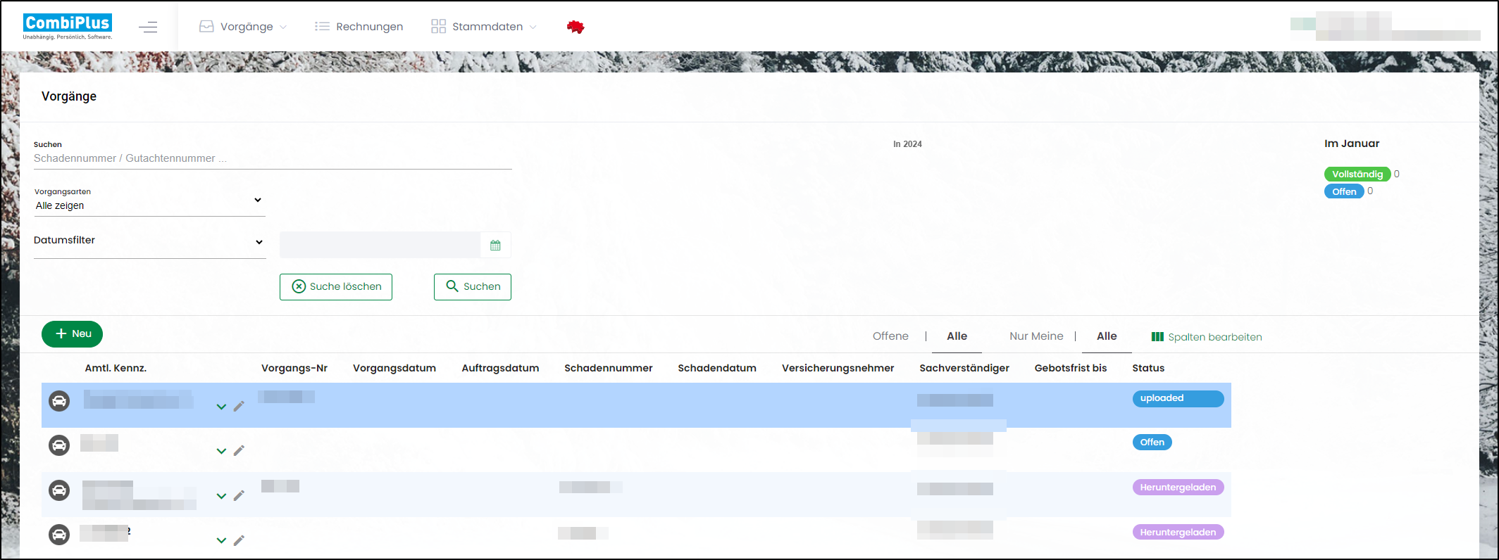 In der Übersicht suchen Sie sich Ihren Vorgang aus der Liste oder Sie nutzen die vorhandenen Suchmöglichkeiten.