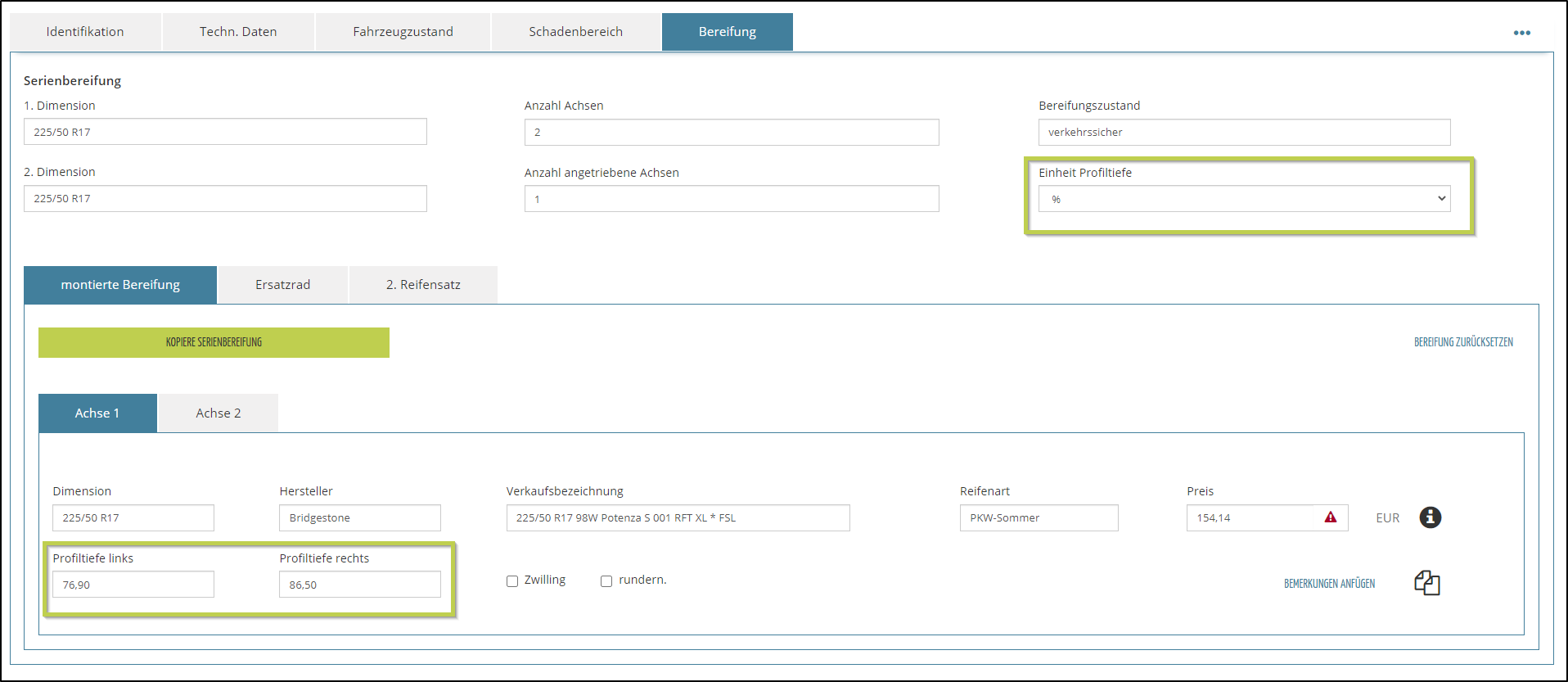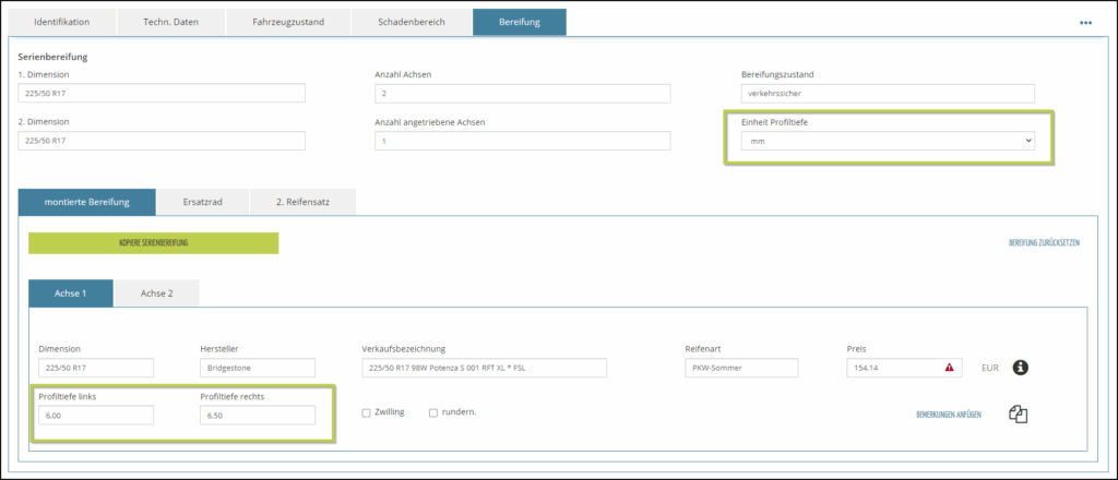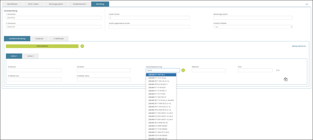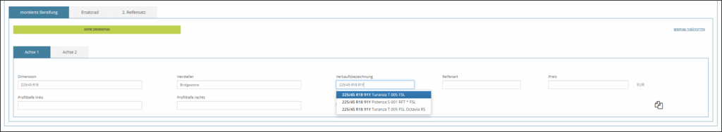 Andernfalls erfassen Sie einfach in der Fahrzeugseite die montierte Bereifung im Feld Verkaufsbezeichnung – hier am Beispiel 225/45.