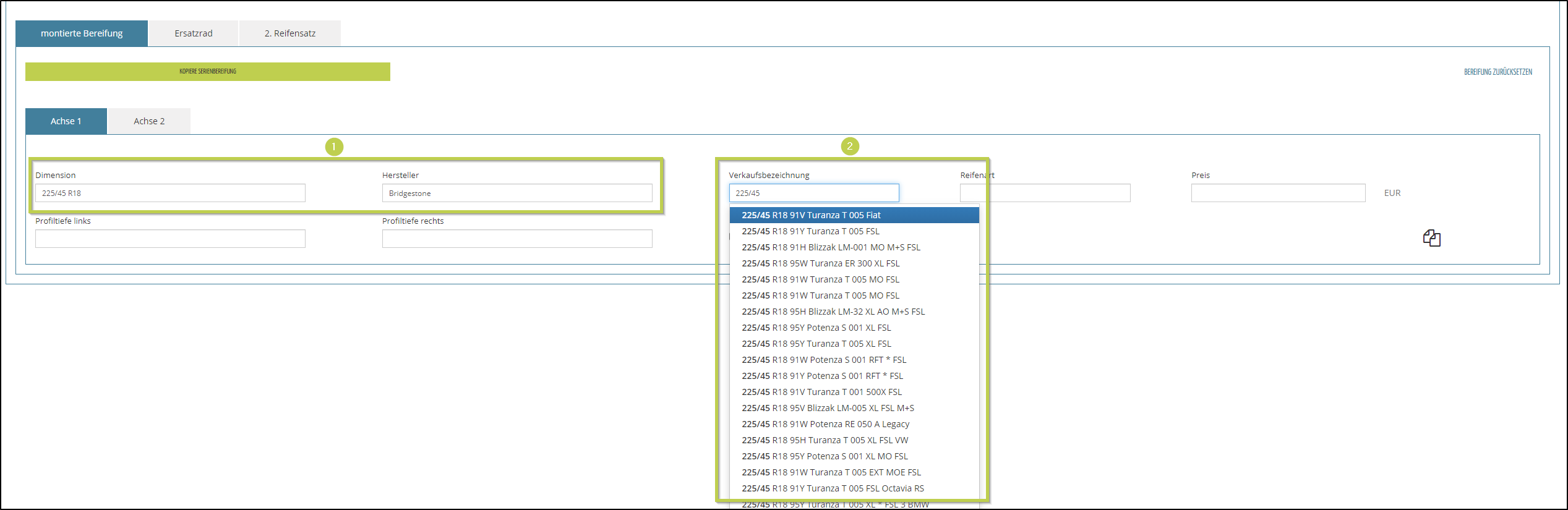 Sollte die montierte Bereifung der Serienbereifung entsprechen, können Sie die Dimension durch Klick auf den Button KOPIERE SERIENBEREIFUNG (1) übernehmen.