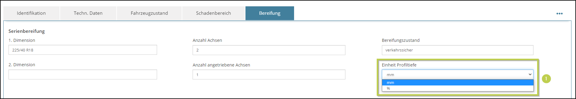 Die Erfassung der Profiltiefe kann wahlweise in mm oder % erfolgen, wobei mm vor eingestellt ist (1).