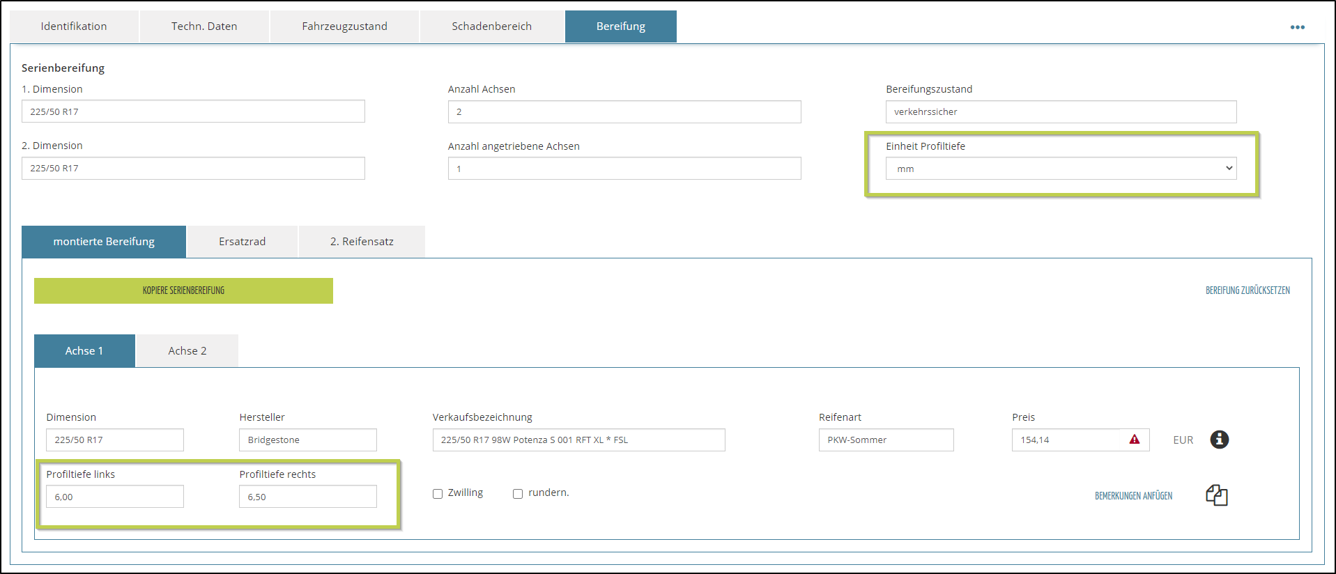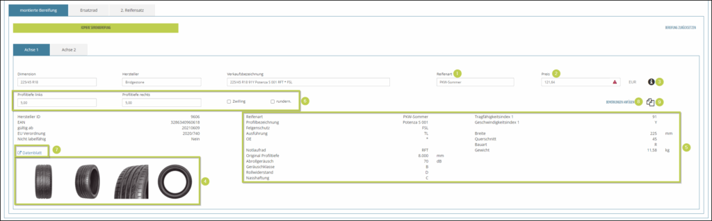 Sie können jetzt die Profiltiefe erfassen und ggf. die Optionen Zwilling und runderneuert aktivieren. (6)