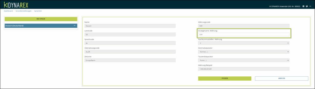 In DYNAREX haben Sie die Möglichkeit zu entscheiden, ob Sie als Währung das Symbol oder den Währungs-Code für Ihre Dokumente drucken können.