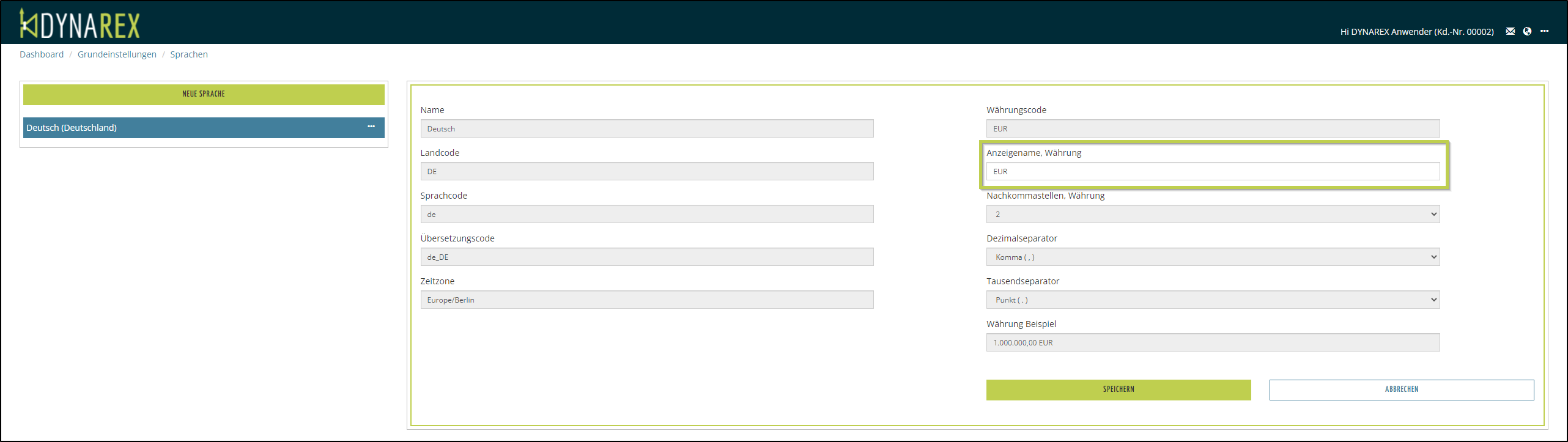 In DYNAREX haben Sie die Möglichkeit zu entscheiden, ob Sie als Währung das Symbol oder den Währungs-Code für Ihre Dokumente drucken können.