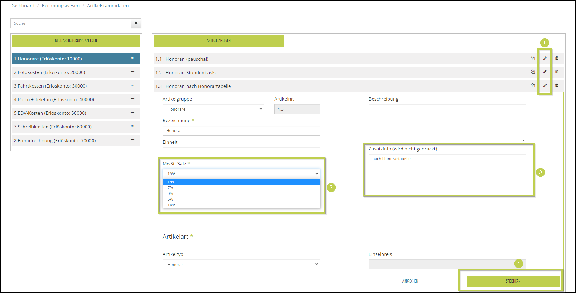 Hier sehen Sie all Ihre Artikelgruppen und Rechnungsartikel. Editieren Sie jeden Rechnungsartikel über das Stiftsymbol (1) und wählen aus der Auswahlliste den gewünschten Mehrwertsteuersatz aus der Auswahlliste (2) aus. Zusätzlich können Sie einen Text bei der Zusatzinfo erfassen (3) und speichern Sie den Artikel (4).