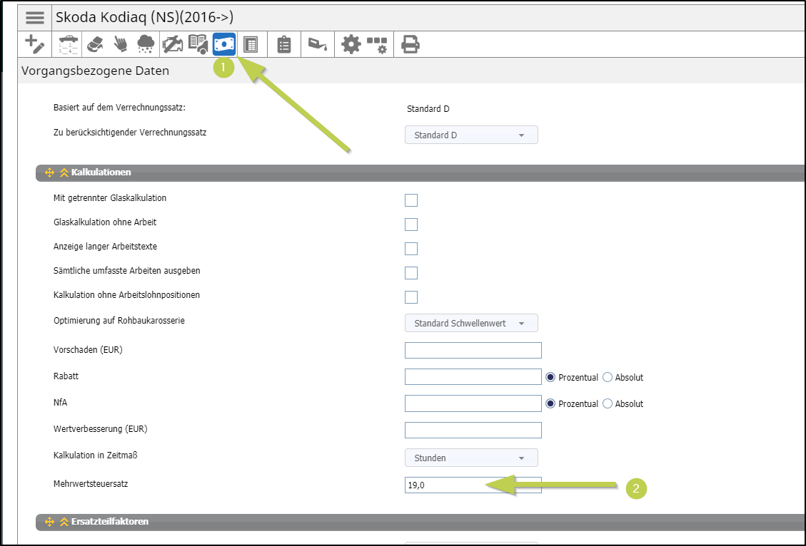Starten Sie in dem Auftrag die grafische Schadenerfassung und wechseln zu den Vorgangsbezogenen Daten (1). Hier (2) können Sie die Mwst. beeinflussen.