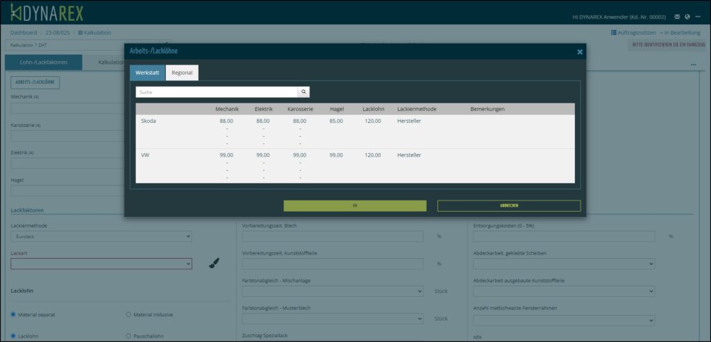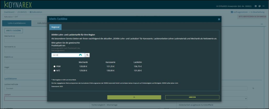 Sollten Sie keine Stundenverrechnungssätze hinterlegt haben, können Sie über den Button „Arbeits-/Lacklöhne“ die Lohn- und Lackiertarife für Ihre Region direkt von der Dekra übernehmen.
