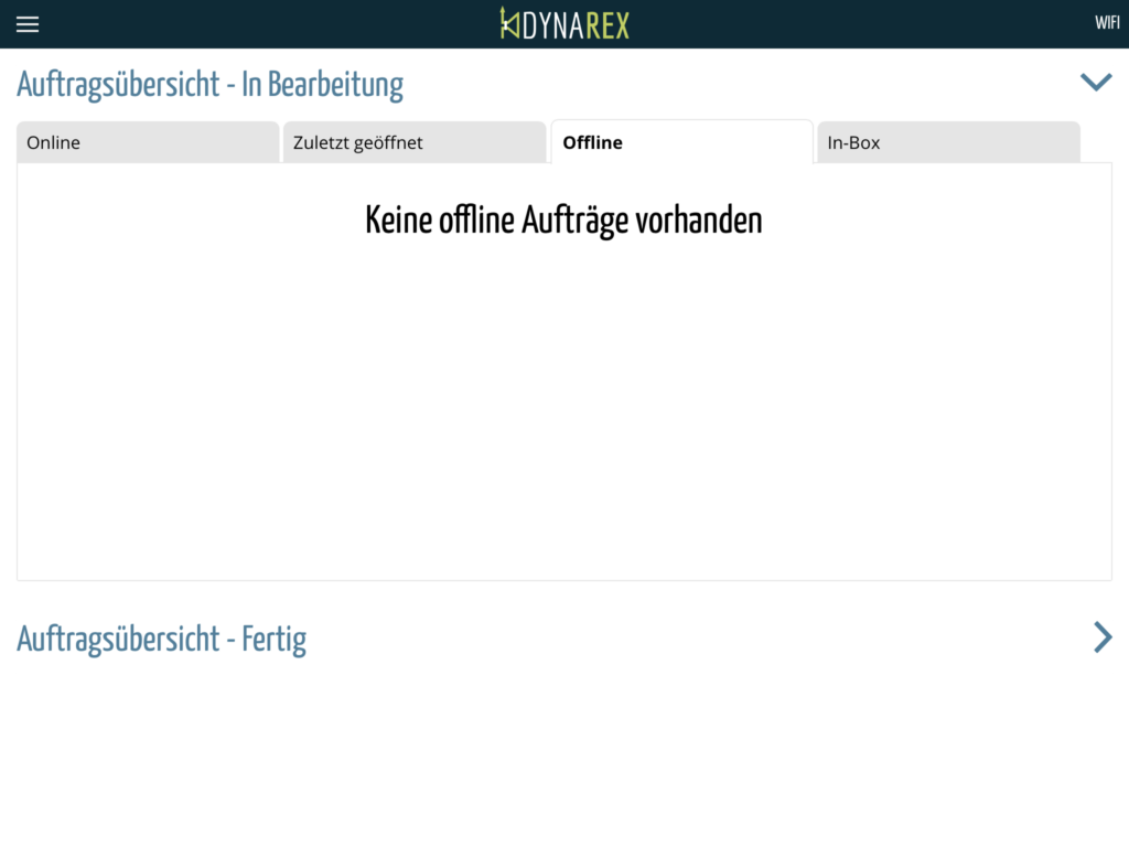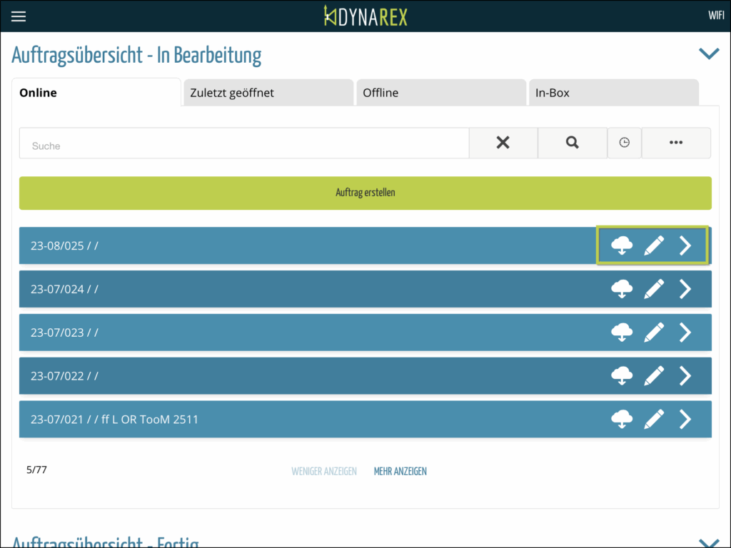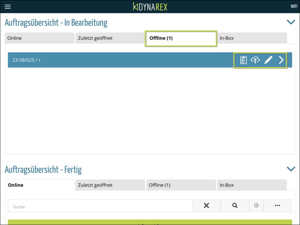Stattdessen wechseln Sie oben über den Reiter Offline in die Offline-Auftragsübersicht und starten die Bearbeitung durch Tipp auf den Stift.
