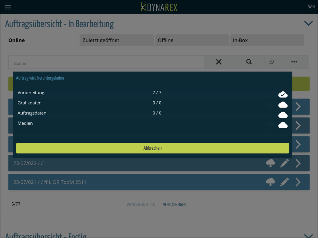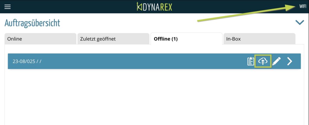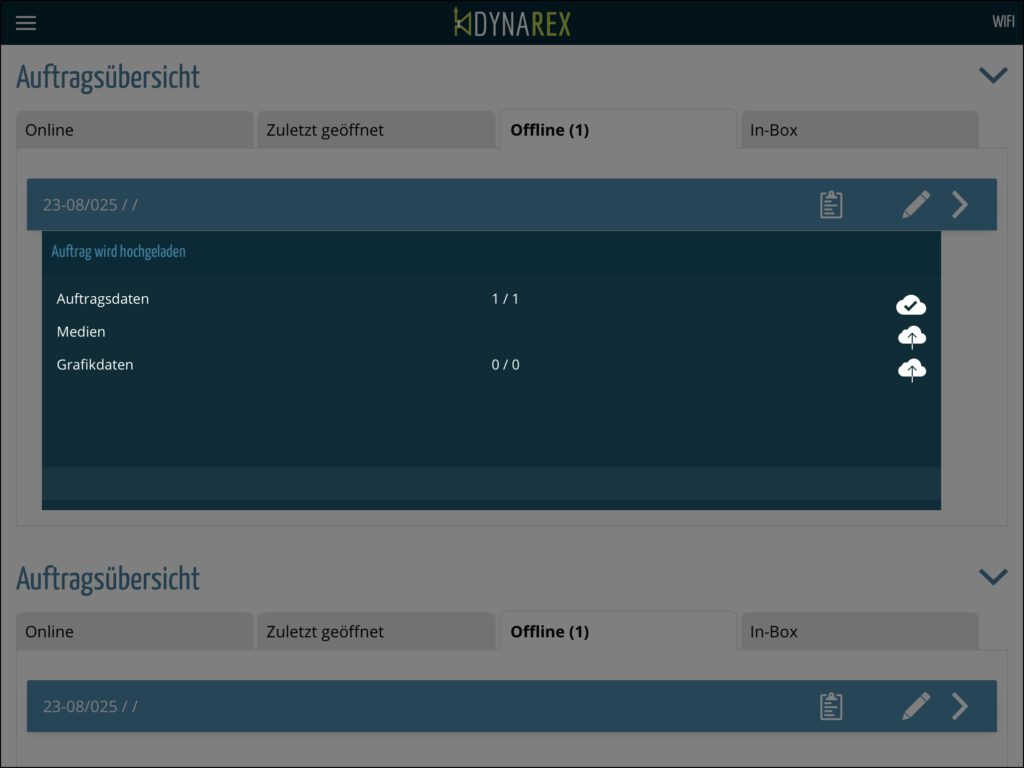 Anschließend wechseln Sie zurück in die Offline-Auftragsübersicht und laden den Fall durch Tipp auf die Wolke wieder hoch.