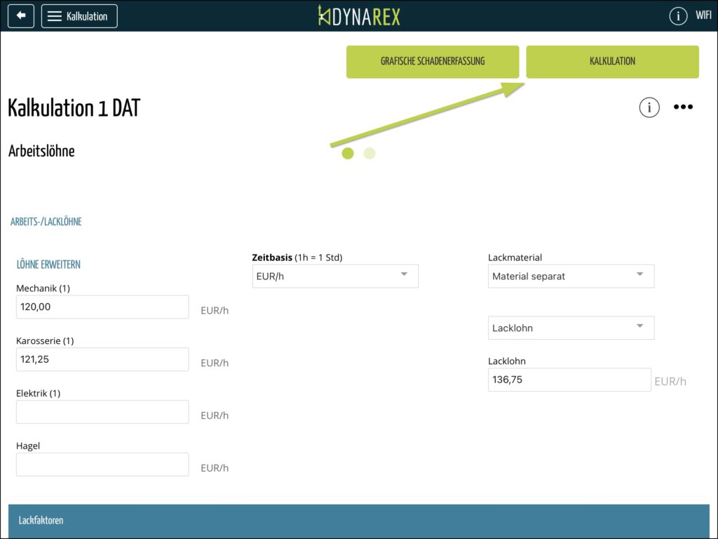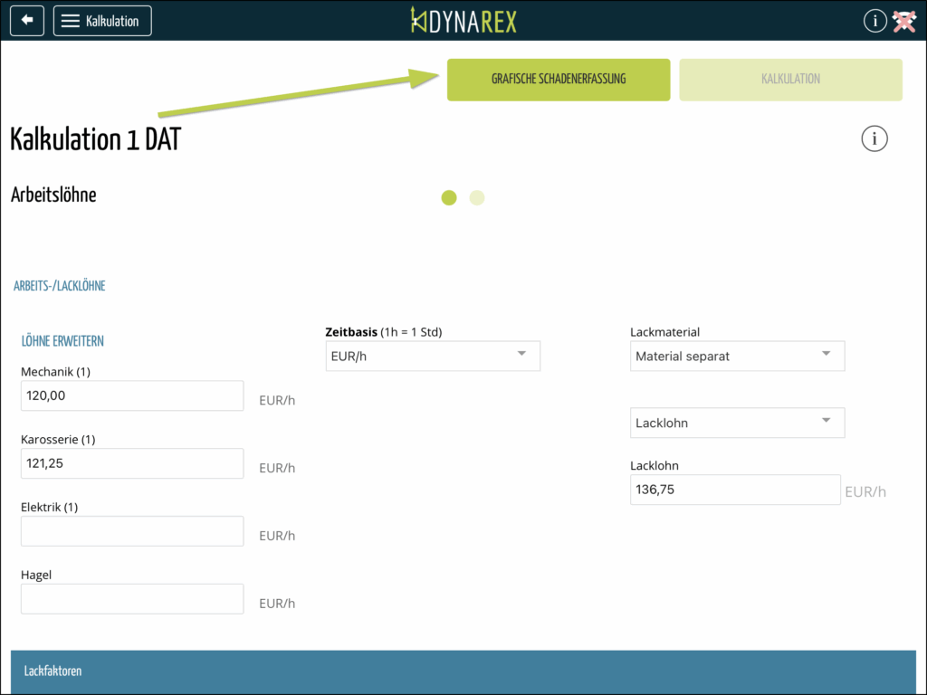 Öffnen Sie die Kachel Kalkulation mit Tipp auf den Stift. Die Stundenverrechnungssätze sind bereits aus dem Adressbuch übernommen. Somit können Sie direkt die grafische Schadenerfassung starten.