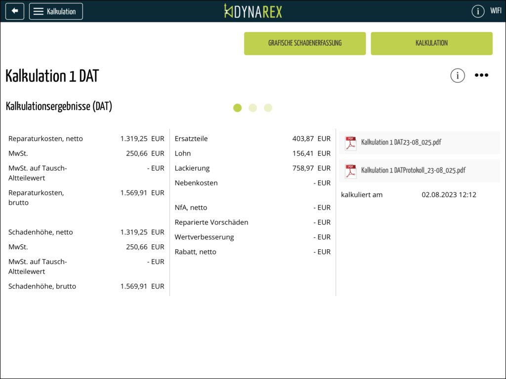 Die Änderungen in der grafischen Schadenerfassung werden gesichert und sobald Ihr Gerät wieder mit dem Internet verbunden ist, können Sie den Button „Kalkulation“ betätigen, um einen Kalkulationsreport zu erstellen.