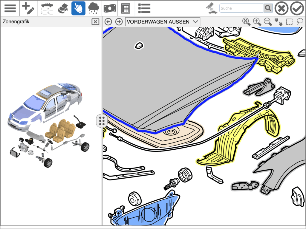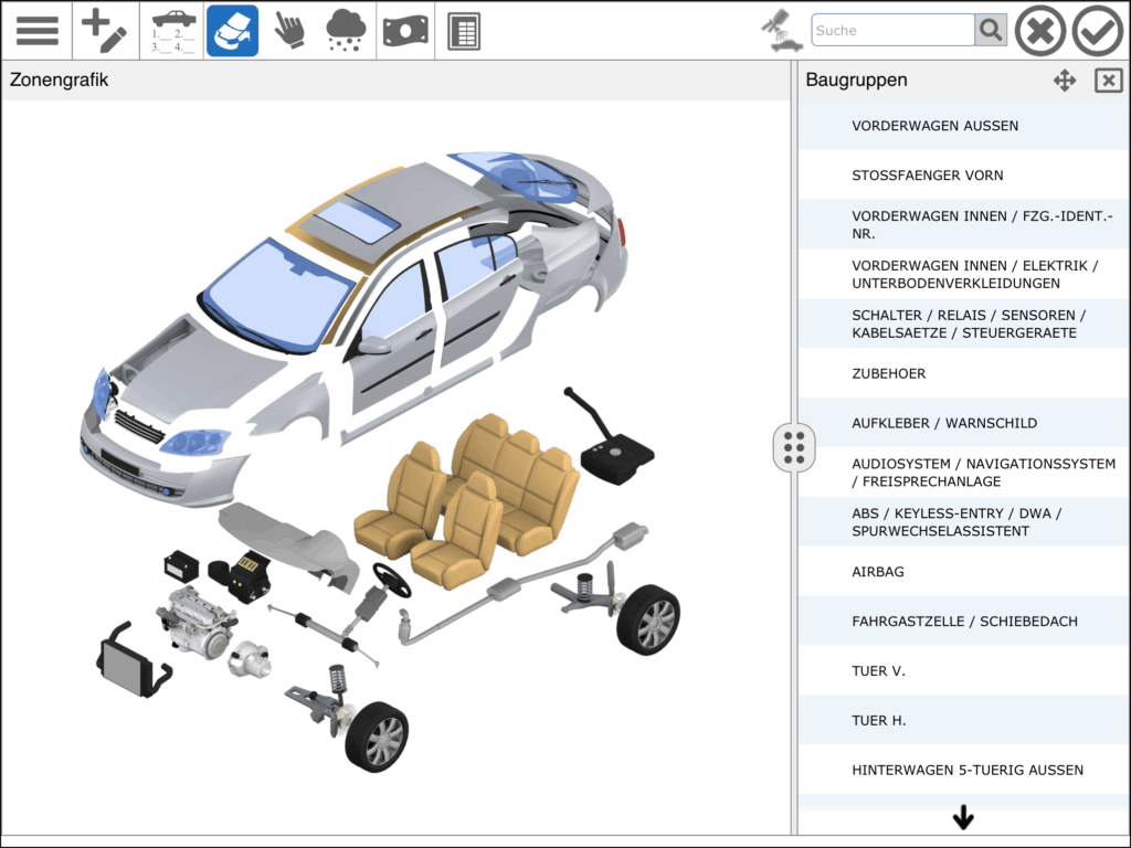 das Navigationsfahrzeug (1.), die Schadenübersicht (2.) und die Baugruppen (3.) zur Verfügung.