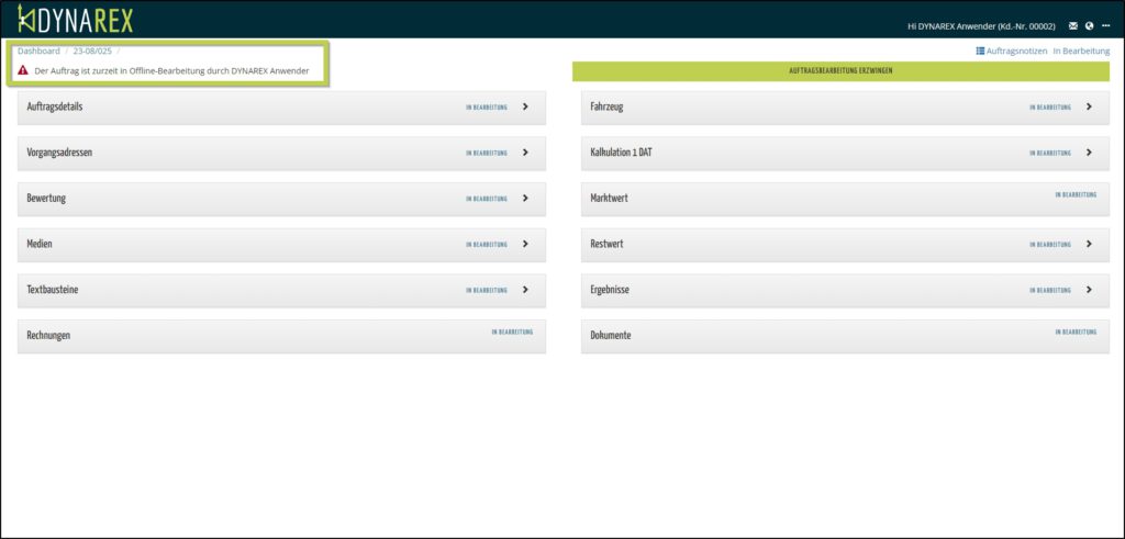 Sie wechseln wieder in die Online-Auftragsübersicht. Der Fall ist zur Bearbeitung aktiv.