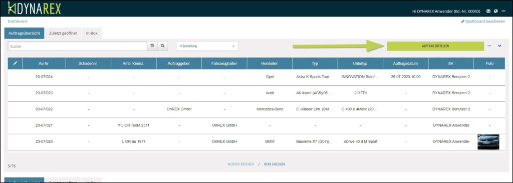 Zuerst legen Sie online Ihren Auftrag an. Das funktioniert am besten, wenn Sie sich mittels Browser im DynaREX anmelden.
