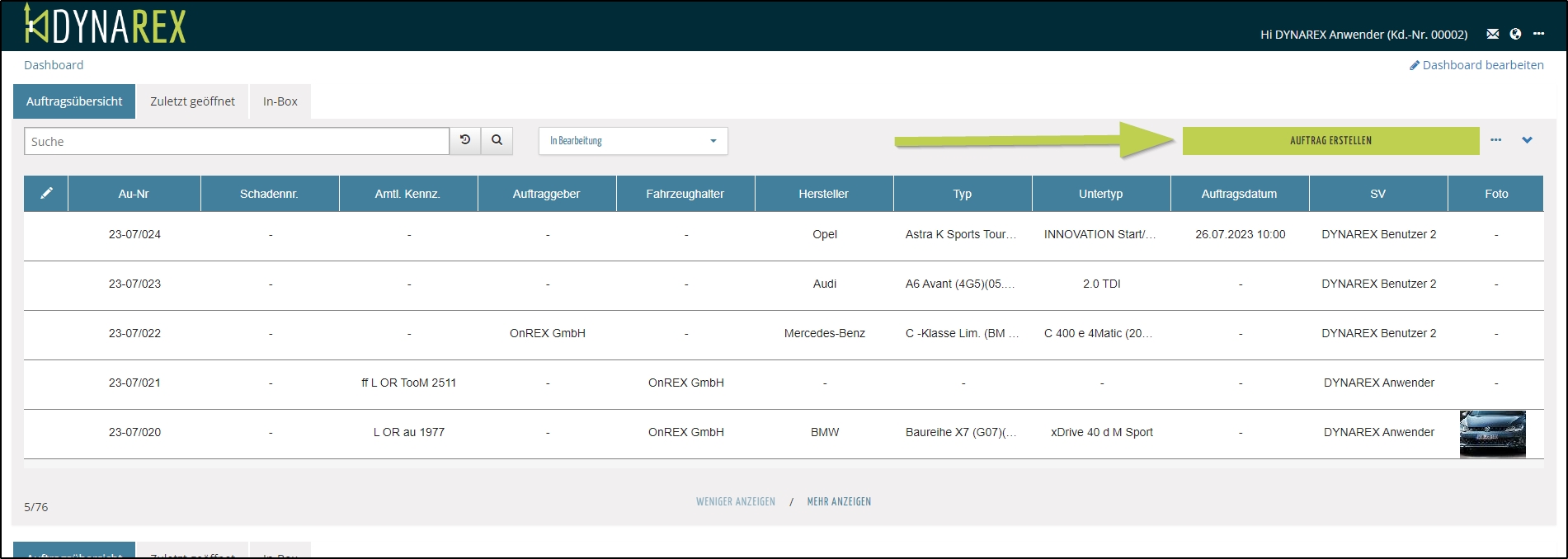 Sie wechseln wieder in die Online-Auftragsübersicht. Der Fall ist zur Bearbeitung aktiv.