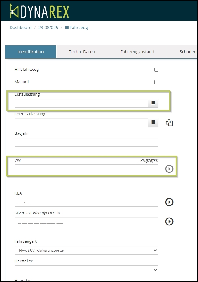 In der Kachel Fahrzeug, erfassen Sie im Bereich Fahrzeugidentifikation die Erstzulassung und identifizieren Ihr Fahrzeug.