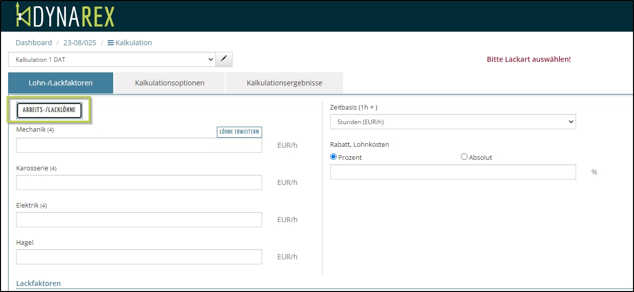 Sollten Sie keine Stundenverrechnungssätze hinterlegt haben, können Sie über den Button „Arbeits-/Lacklöhne“ die Lohn- und Lackiertarife für Ihre Region direkt von der Dekra übernehmen.
