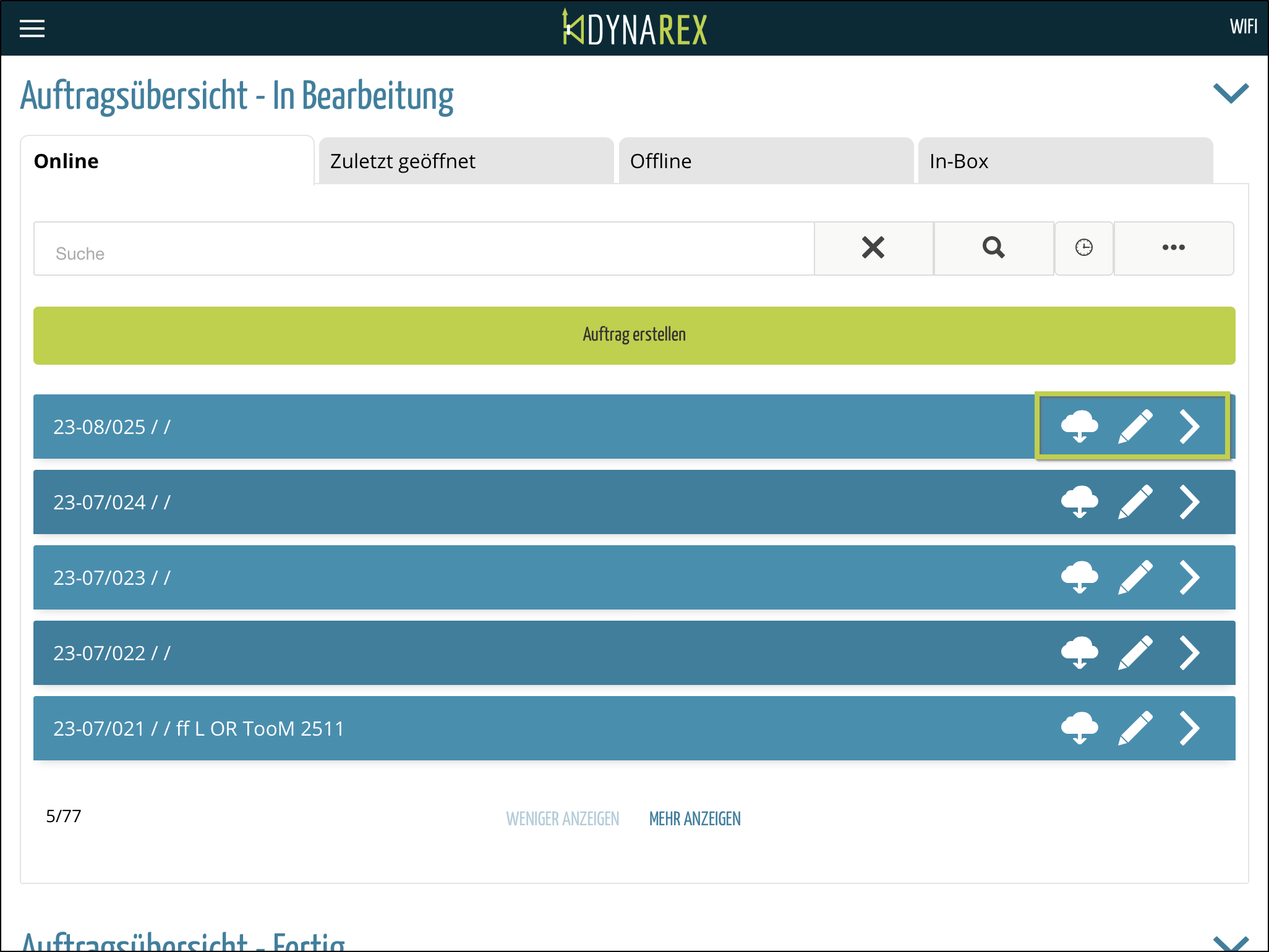 Stattdessen wechseln Sie oben über den Reiter Offline in die Offline-Auftragsübersicht und starten die Bearbeitung durch Tipp auf den Stift.