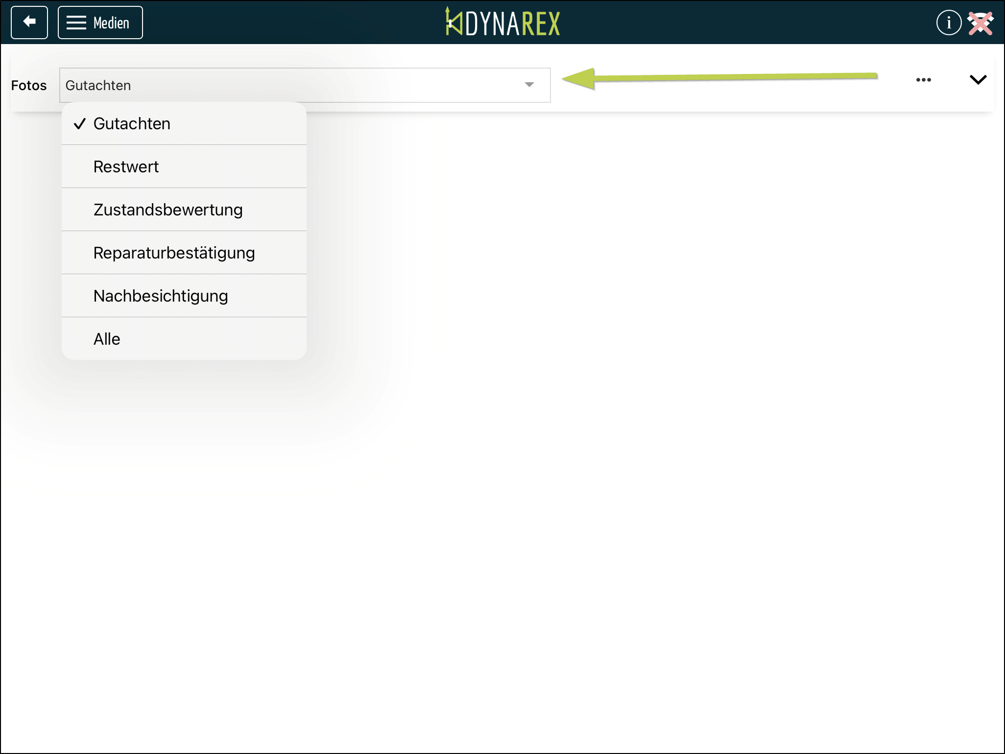 Über das Dropdown-Menü können Sie auswählen, in welchem Teil des Auftrages die Fotos hinzugefügt werden sollen