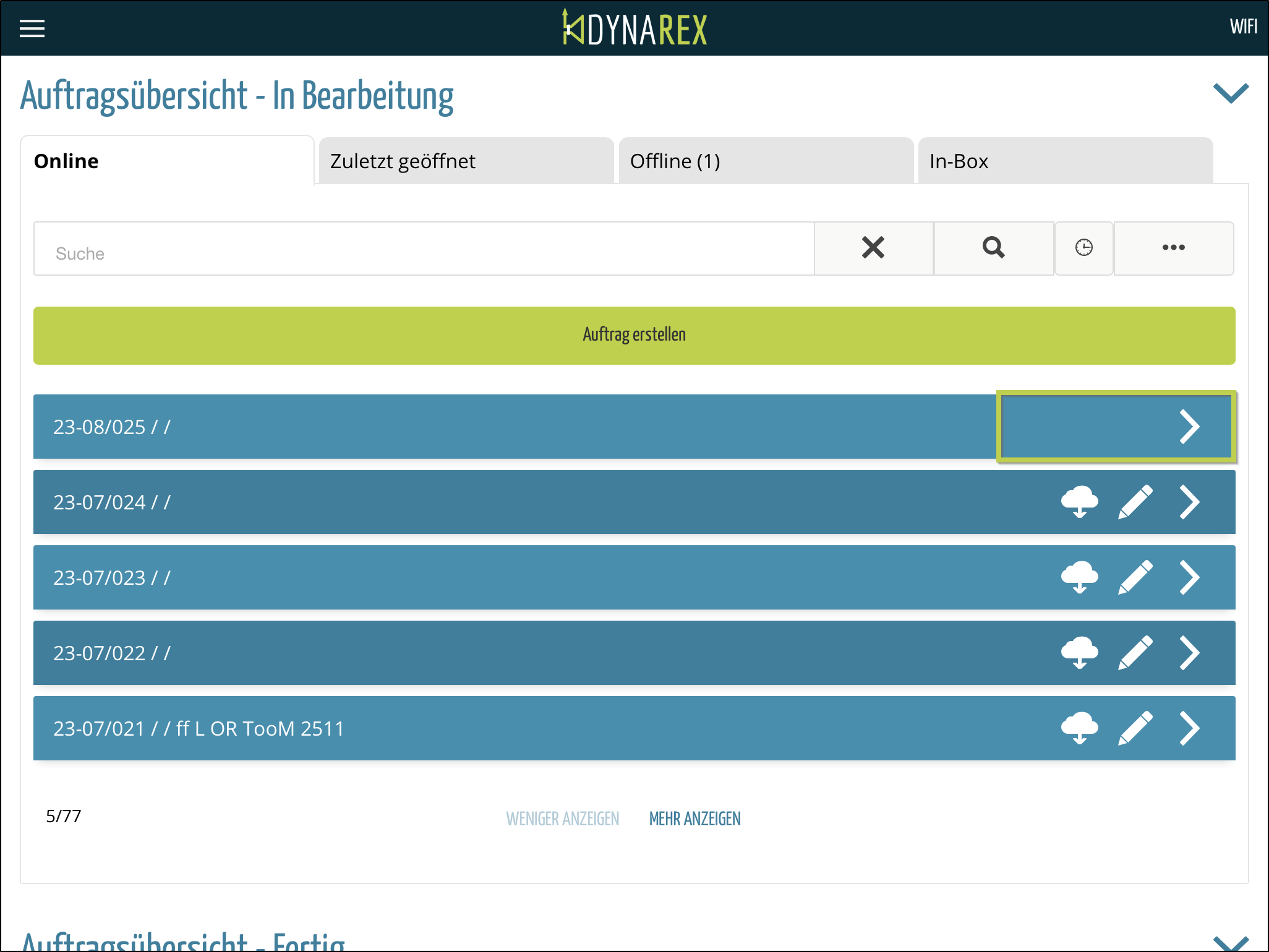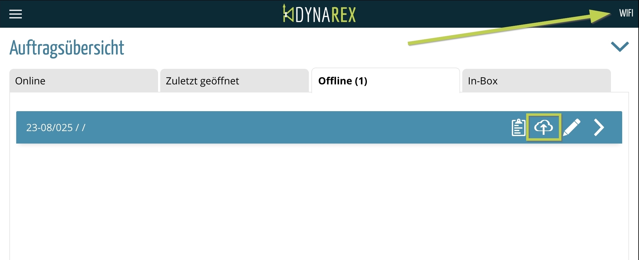 Anschließend wechseln Sie zurück in die Offline-Auftragsübersicht und laden den Fall durch Tipp auf die Wolke wieder hoch.
