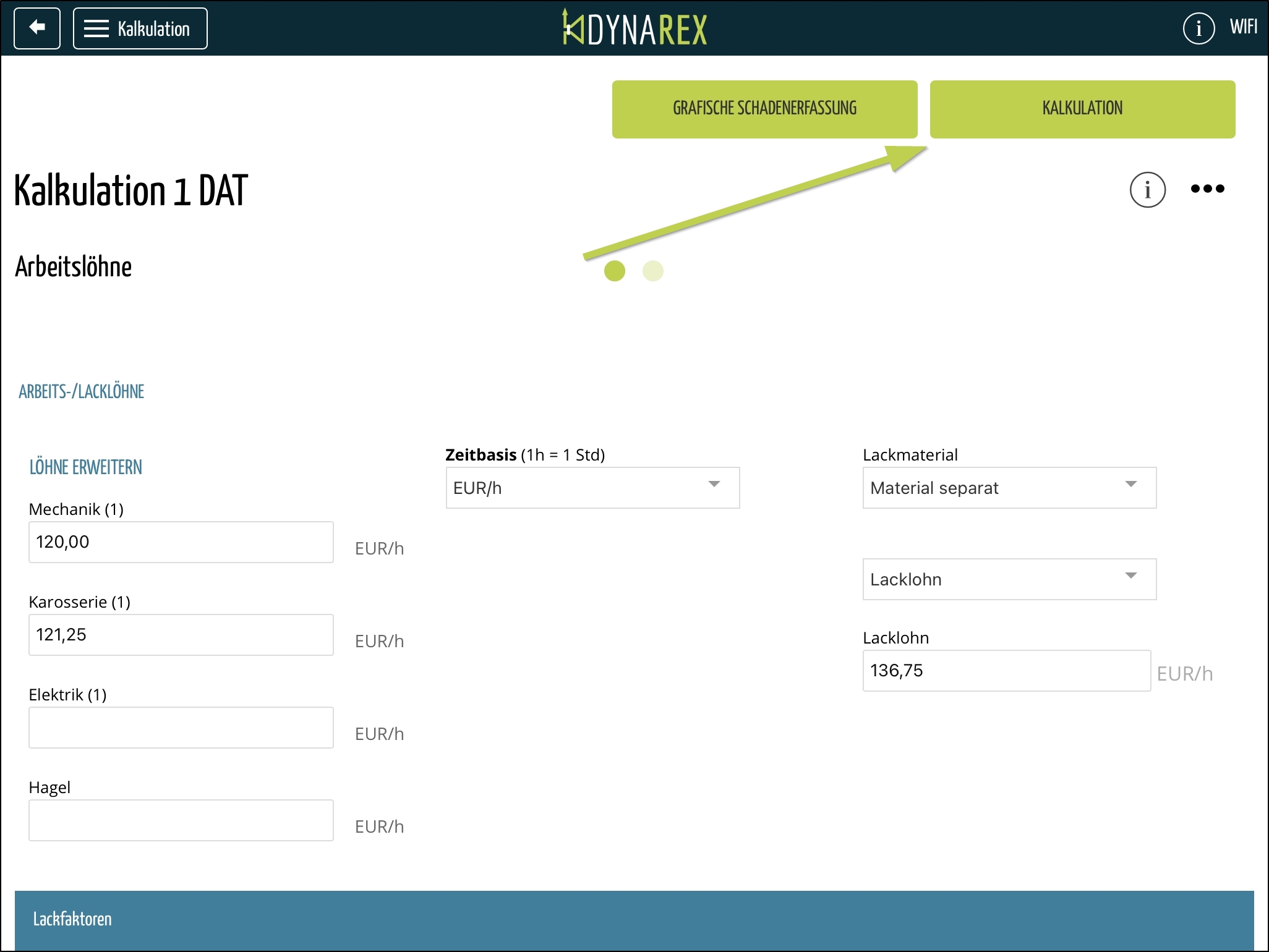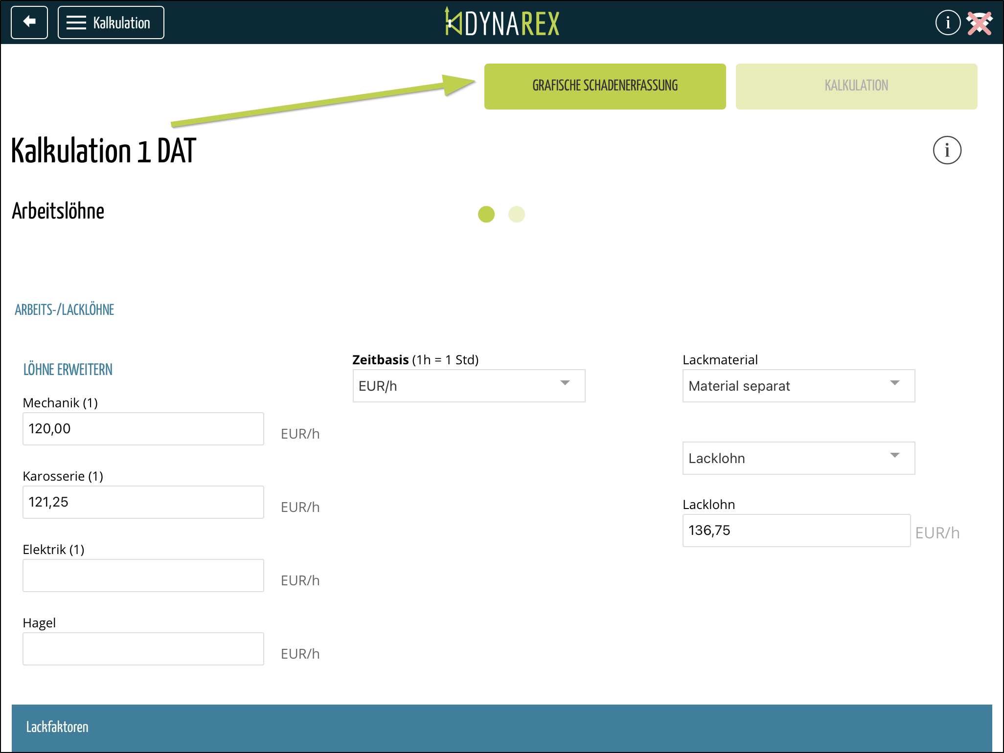 Öffnen Sie die Kachel Kalkulation mit Tipp auf den Stift. Die Stundenverrechnungssätze sind bereits aus dem Adressbuch übernommen. Somit können Sie direkt die grafische Schadenerfassung starten.