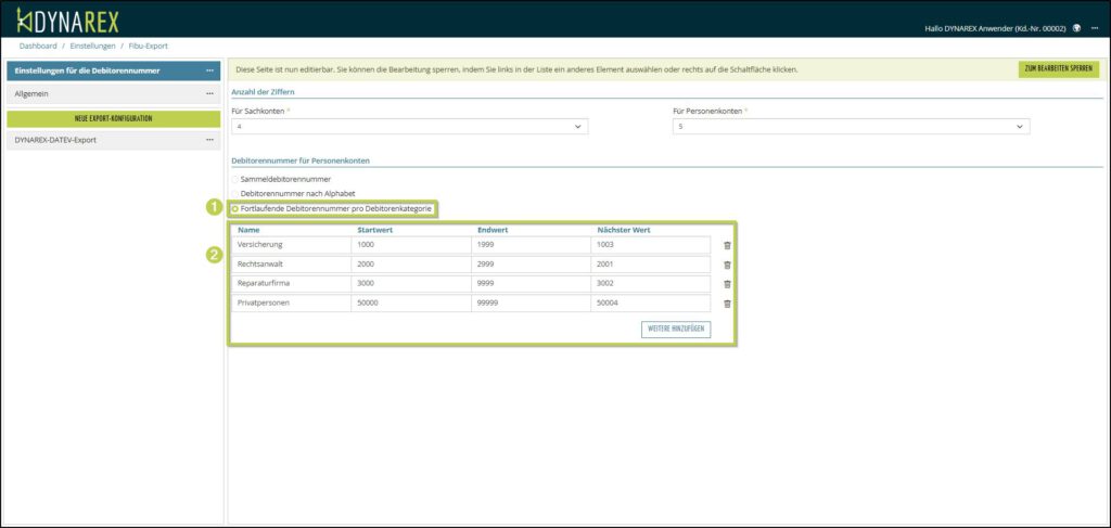 Hier kann man entweder eine eigene Debitorennummer (1) manuell erfassen oder die nächste Nummer über das System generieren (2) lassen.