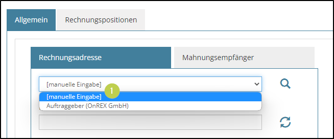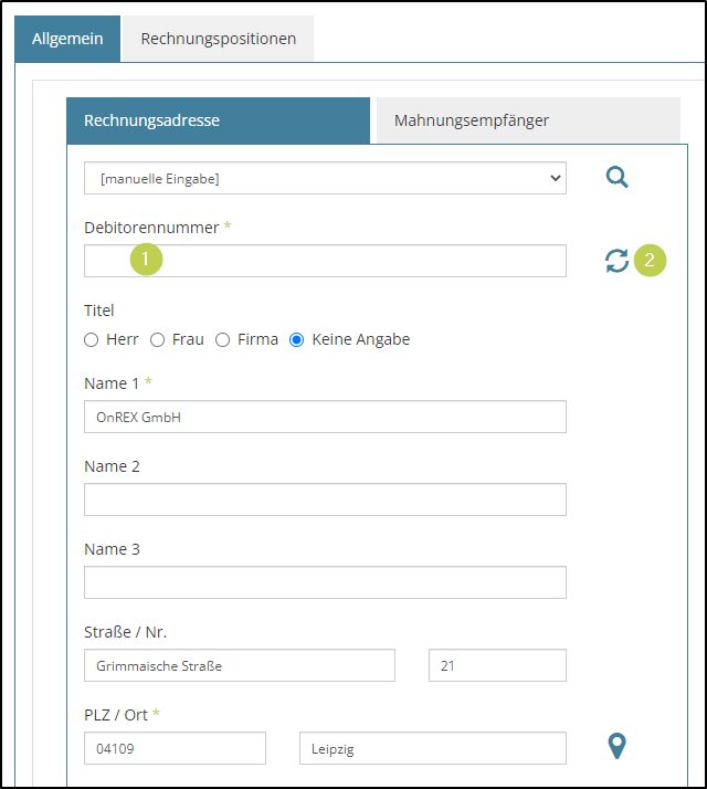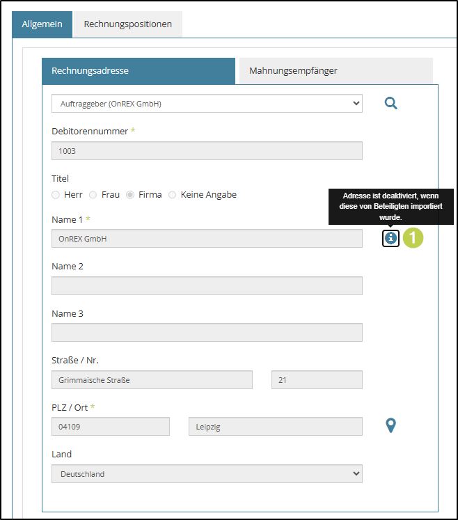 Wenn der Rechnungsempfänger bereits im Adressbuch eine Debitorennummer hat, ist die Bearbeitung mit einem entsprechendem Hinweis (1) gesperrt.