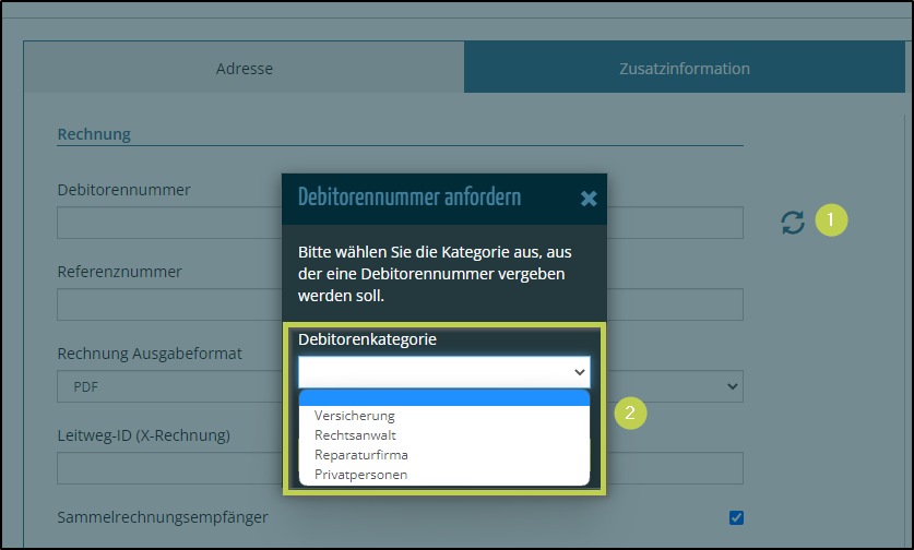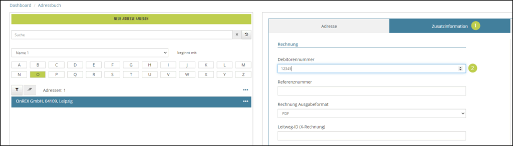 Im Tab Zusatzinformationen (1) können Sie manuelle eine Debitorennummer (2) erfassen.