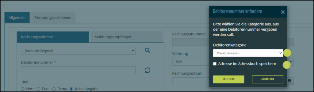 Bei der Generierung über die Anwendung muss wieder eine Debitorenkategorie (1) gewählt werden und es besteht zusätzlich die Möglichkeit, die Adresse gleich im Adressbuch zu speichern (2).