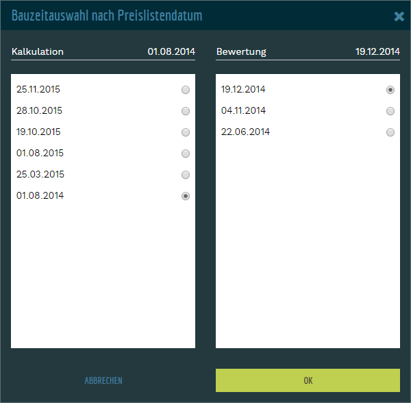 Der Dialog kann jederzeit über das Stiftsymbol aufgerufen und somit eine andere Preisliste gewählt werden.