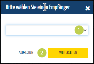 In dem Dialog Bitte wählen Sie einen Empfänger können Sie in dem Listenfeld einen anderen Sachverständigen auswählen, welcher den Auftrag bearbeiten soll. Bestätigen Sie den Dialog mit WEITERLEITEN: